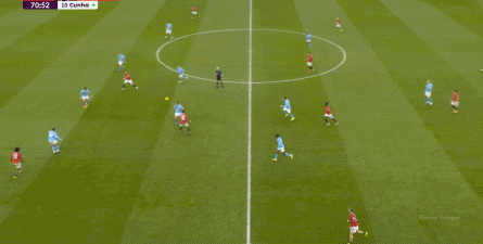 对阵曼城的第一个进球,当然是来自本方半场防下的任意球,但你要注意看到的是,在布鲁诺带球快速向前的路上,多尔古、姆贝乌莫和阿玛德-迪亚洛全部都在冲刺: